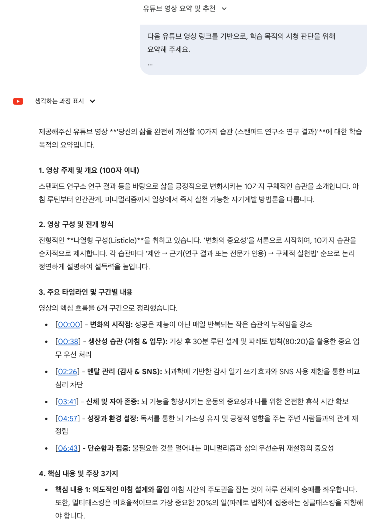 요약 결과가 나오길 기다리는 것이 아니라 다시 관심이 있는 영상을 찾고, 음 이제 다 됐을라나? 하고 고정된 탭을 누르고 요약 결과를 확인하는 식이다. 괜찮으면 영상을 다시 천천히 보면서 이해도를 높인다.