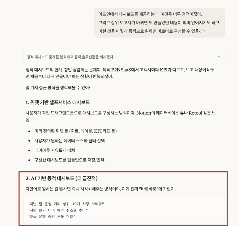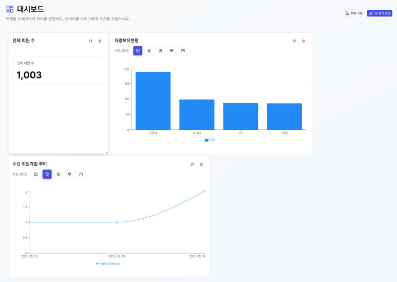 프로젝트 제목 :AI 대시보드 PoC목표 :자연어로 요청하면 자동으로 차트(그래프)를 만들고 나만의 대시보드를 만들 수 있게 한다.