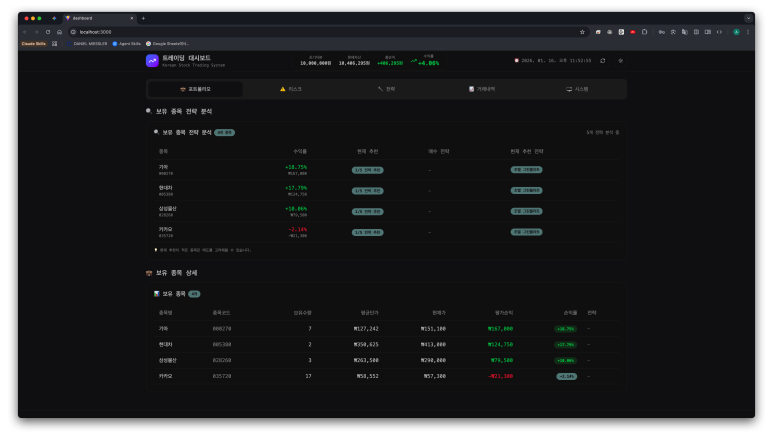 여러 AI에게 계획을 세우고 리뷰하고 개발하는 반복 과정을 거치면, 주식을 잘 모르는 비개발자도 자동 매매 프로그램을 만들 수 있다. 무작정 시작해서 3주 만에 모의투자 대시보드까지 완성한 이야기다.