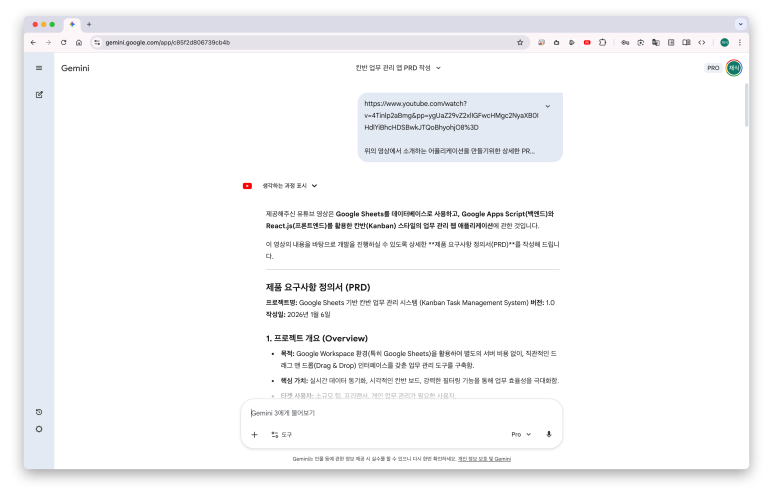 유튜브 URL 을 복사해서 Gemini 에게 이 영상을 보고 PRD를 만들어 달라고 요청한다.