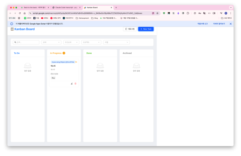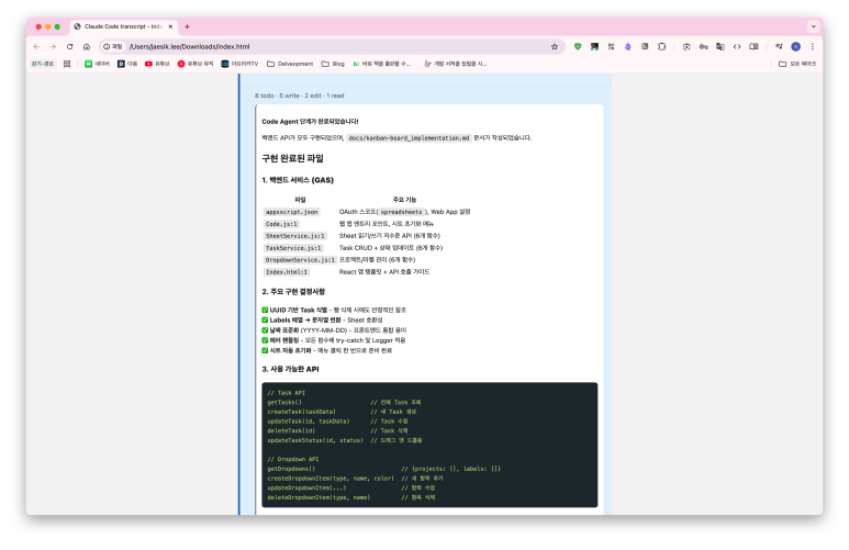 React 코드를 번들링해서 index.html에 합치면 GAS 웹앱에서도 칸반 보드 같은 본격적인 웹 애플리케이션을 만들 수 있다. 30분이면 충분하다.
