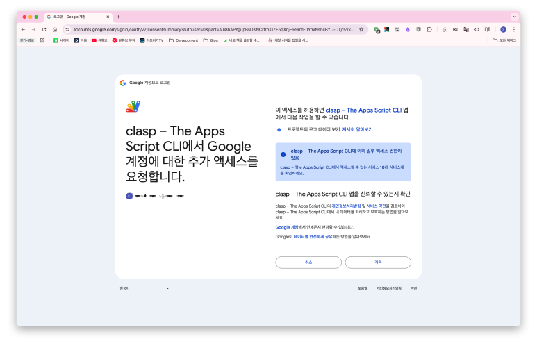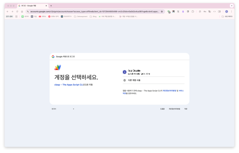 터미널에서 clasp login 시 Google 권한 승인 화면으로 자동으로 열리고, 계정을 선택한다.