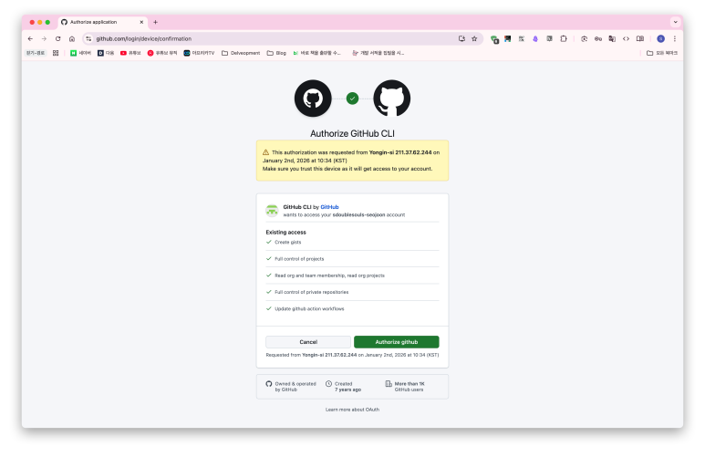 GitHub는 코드를 저장하고 관리하는 온라인 저장소 서비스인데, Github CLI는 명령어로 레포지토리(저장소) 생성, 비밀 키 등록 등을 자동화하기 사용하는데, Github 웹사이트에 들어가지 않고도 조작할 수 있게 해주는 도구이다.
