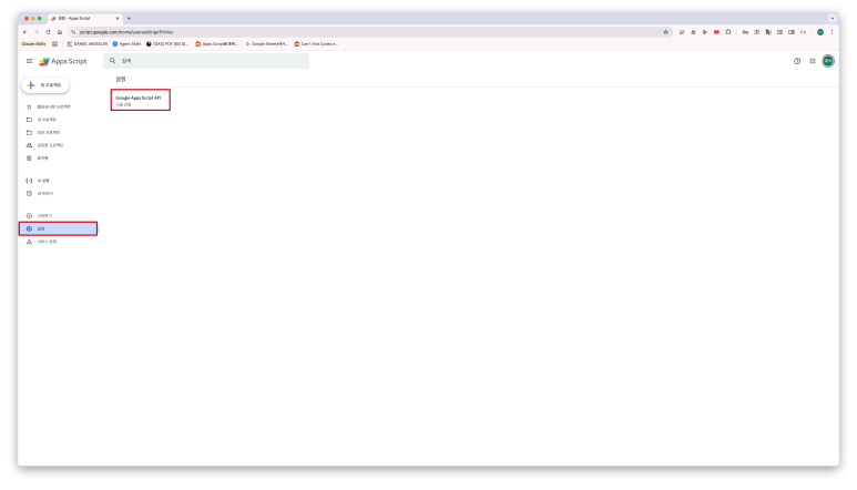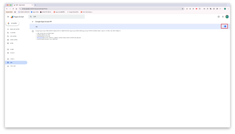 본인의 Apps Script 대시보드에 접속한 후 설정 버튼을 클릭한 후 ****Google Apps Script API ****사용으로 변경을 해야 한다.