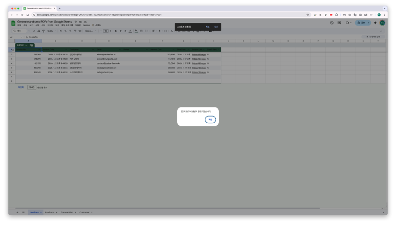 - Invoices 시트의 `Email Sent` 값이 'N'인 건만 발송하고 'Y'로 업데이트합니다.